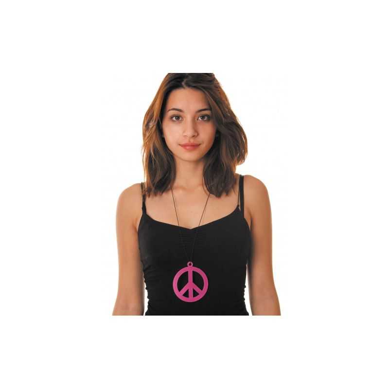 Diamètre : 8,5cm - Pendentif Peace and Love fluo de couleur rose pour vous déguiser en hippie vraiment cool raoul. Avec fil noir élastique
