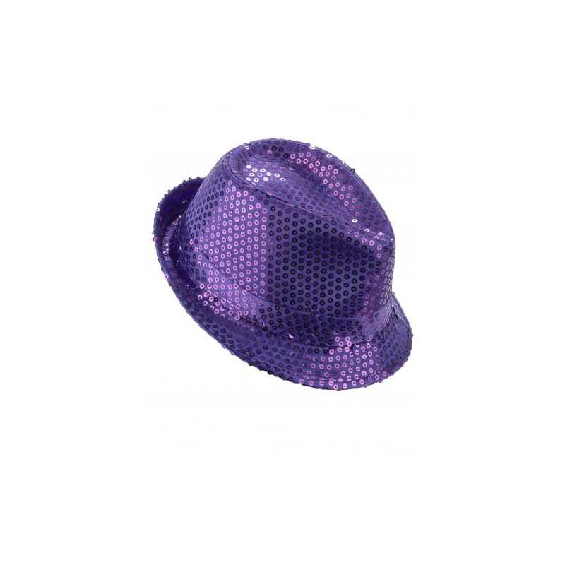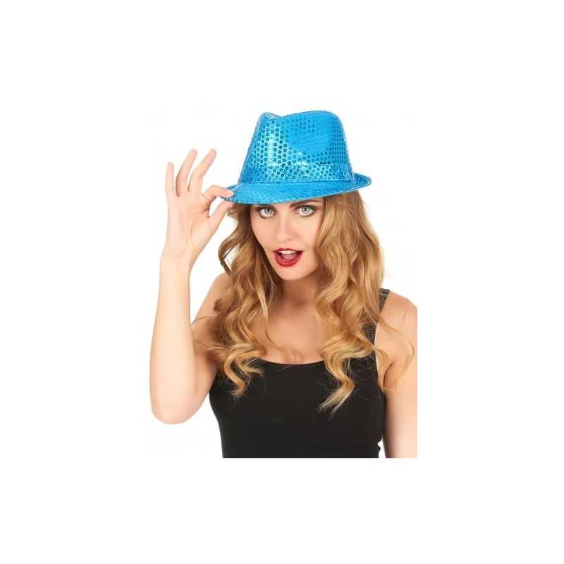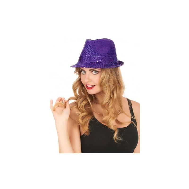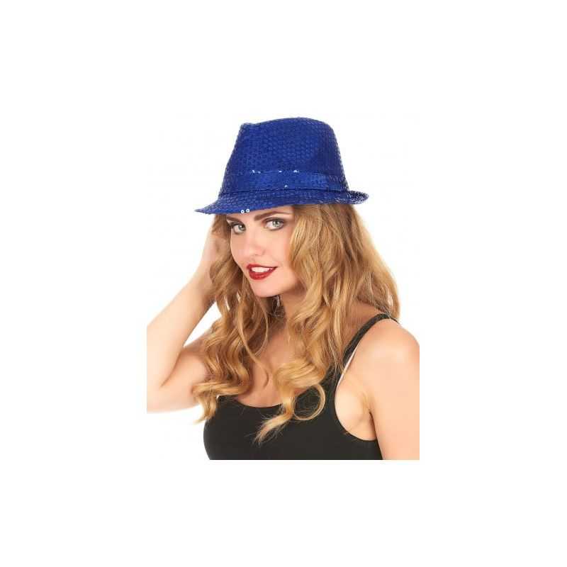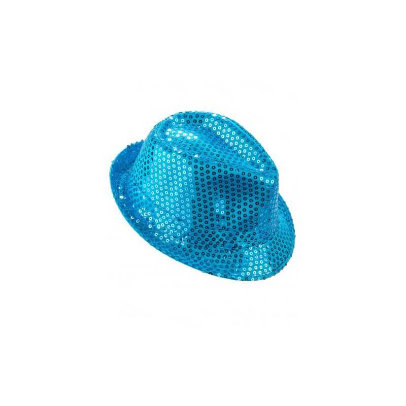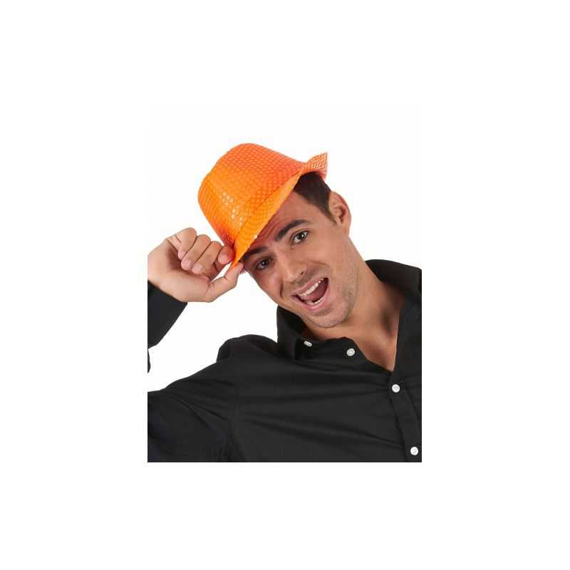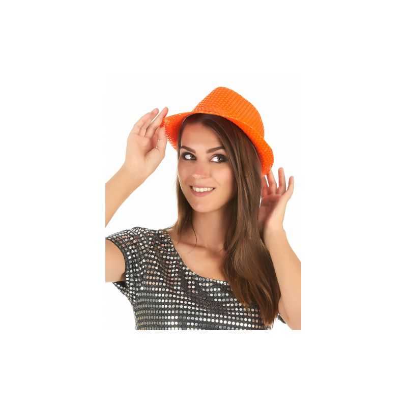 Chapeau de soirée à sequins pour adulte, de couleur fluo, de type borsalino, idéal pour une soirée dansante à thème accessoire fluo. Disponible en différents coloris : rose, rouge, bleu turquoise, bleu foncé, argent, or, orange, violet, noir.