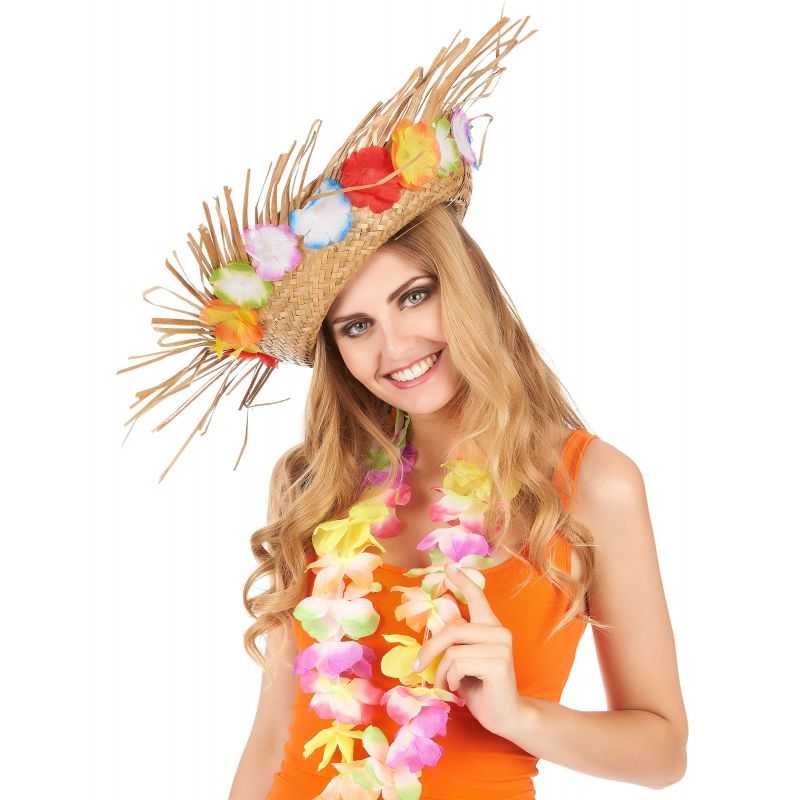 Chapeau de paille vraiment fun et original, avec des fleurs synthétiques de type hibiscus pour se déguiser comme si vous passiez vos vacances à Hawaï, à Tahiti ou dans les Caraïbes.