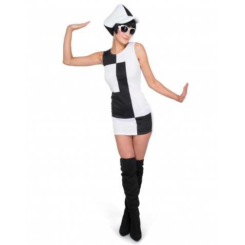 Déguisement noir et blanc pour femme comprend : robe courte et moulante esprit seventies et le chapeau assorti (attention ne comprend ni lunettes ni bottes noires).