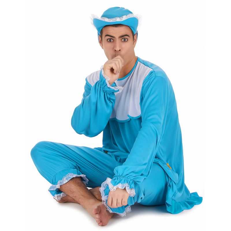 Déguisement bleu adulte de bébé pour homme. Modèle homme taille M/L (taille 48 / 52). Déguisement bébé bleu comprend : coiffe bleue, top bleu et pantalon bleu. Costume adulte de bébé idéal pour déguiser le futur marié à l'occasion de son enterrement de vie de jeune garçon, son evg.