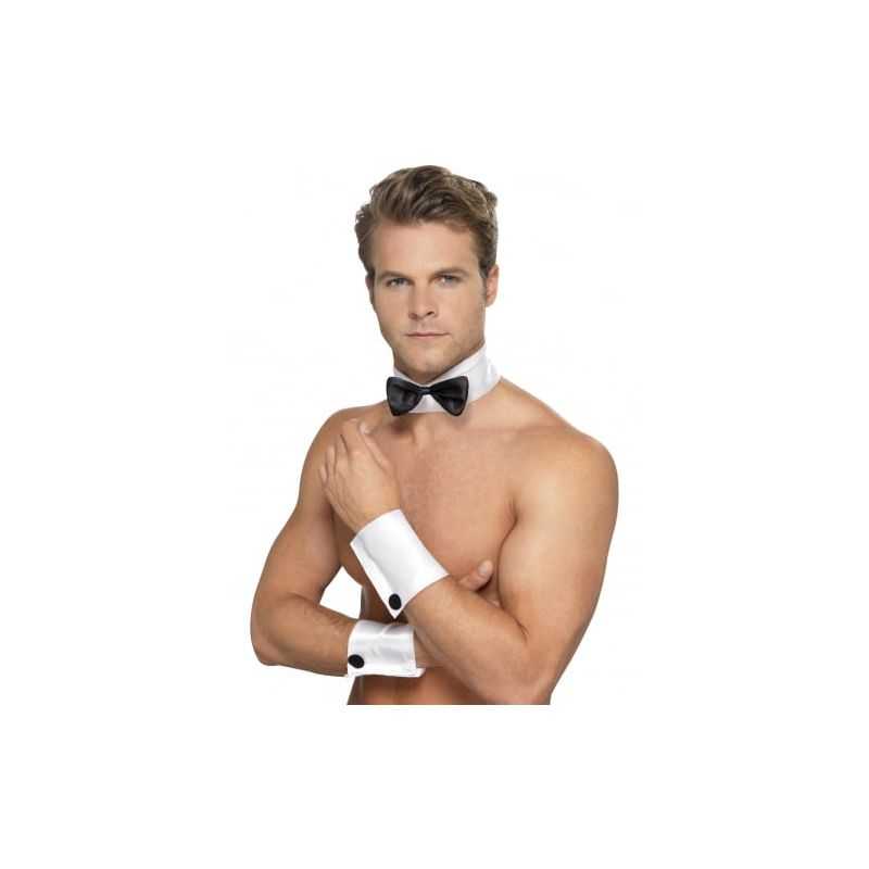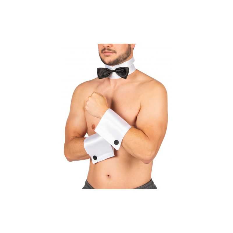 Ce kit Chippendale pour se déguiser en strip teaser comprend noeud papillon et 2 manchettes, le tout s'attache et s'enlève à l'aide de scratch (ne comprend pas le faux buste musclé avec tablettes de chocolat bien dessinées). Allez, on file à la salle de musculation maintenant ?