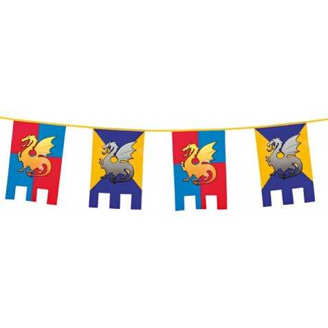 Matière : plastique - longueur : 6 mètres. Guirlande déco thème Chevaliers, fête médiévale. Guirlande avec de grands fanions (dimensions de chaque fanion : 20 x 30cm) aux couleurs des chevaliers avec un motif de dragon. A vous les joutes et autres combats entre chevaliers !