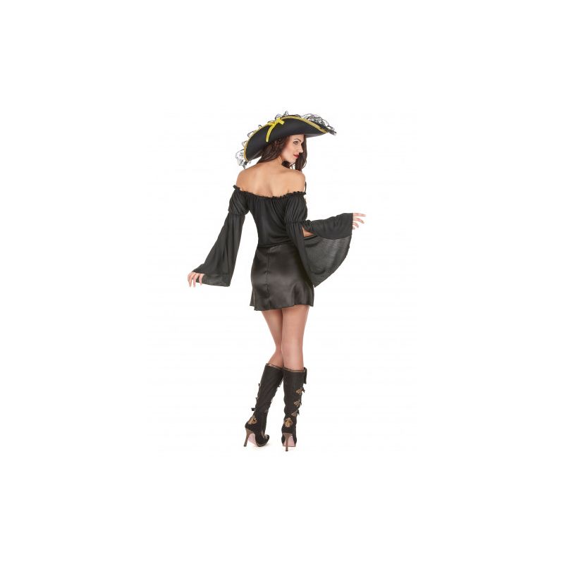Costume disponible en plusieurs tailles. Se déguiser en femme rebelle, en femme pirate avec une jolie robe noire,... chic et rebelle à la fois