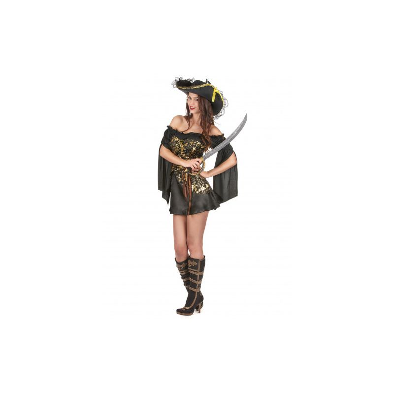 Déguisement noir et doré Corsaire femme adulte comprend : robe courte de pirate et coiffe de pirate (attention ne comprend pas épée de pirate ni bottes)